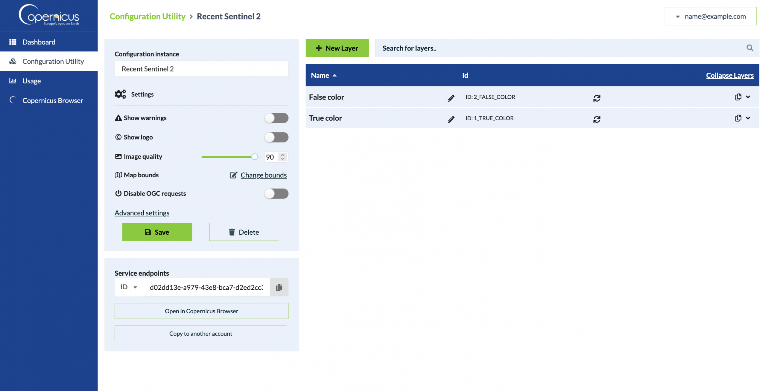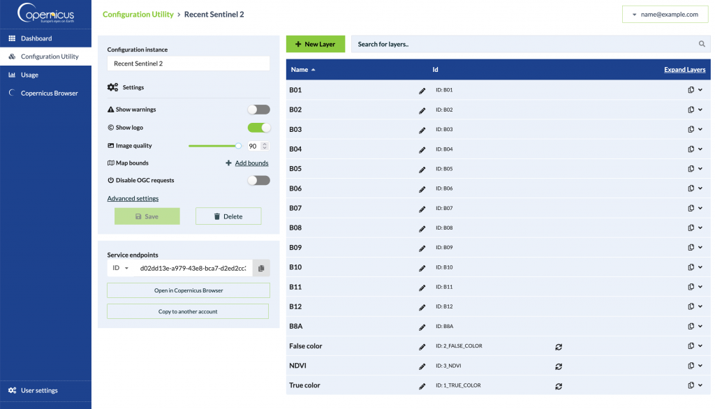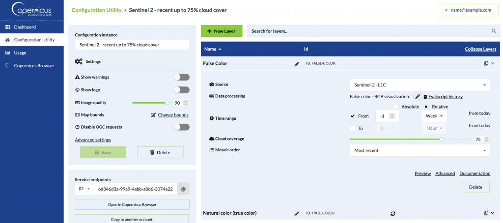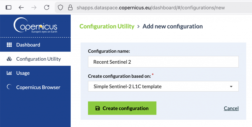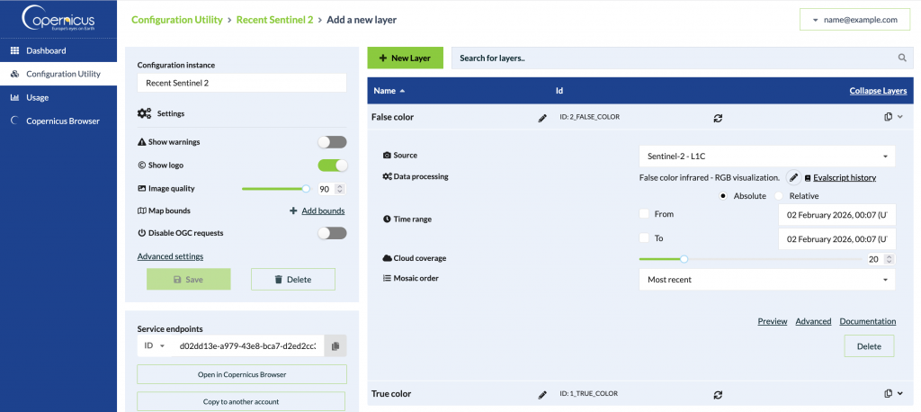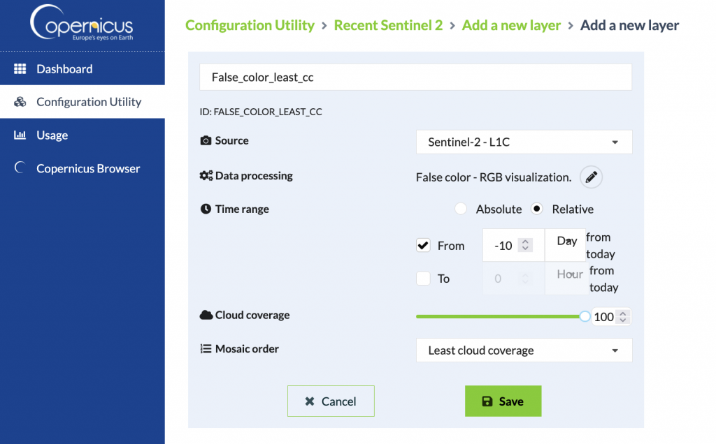While the Copernicus Browser lets you browse and see satellite imagery, in order to get a tile-set with parameters you choose, you’ll need to create an account and a data configuration within the Copernicus utility.