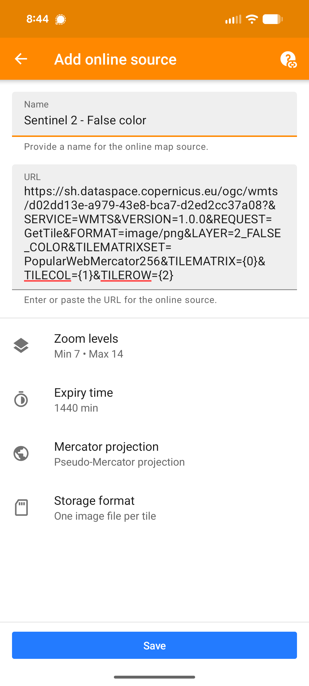 Set the Zoom Levels to 7-14 as Copernicus doesn’t serve tiles outside of this range and this will allow OsmAnd to over-zoom the tiles as needed.